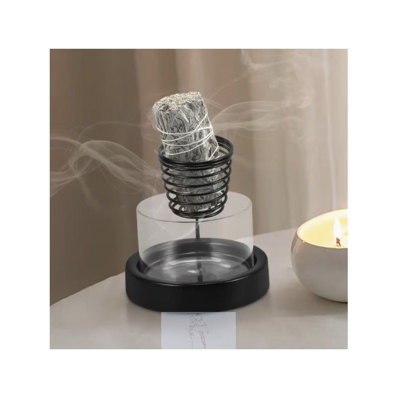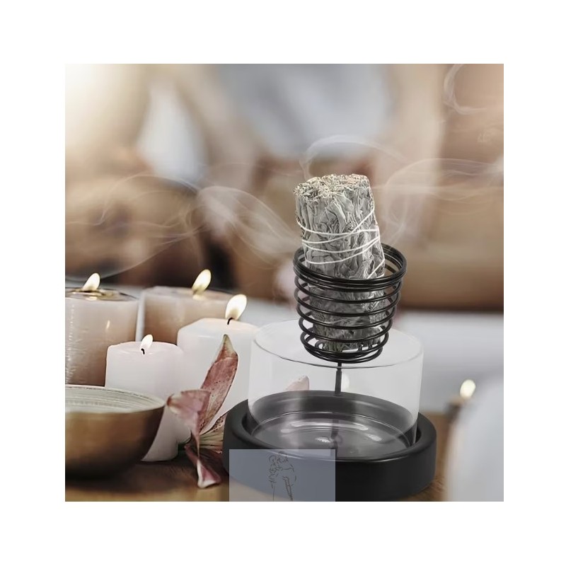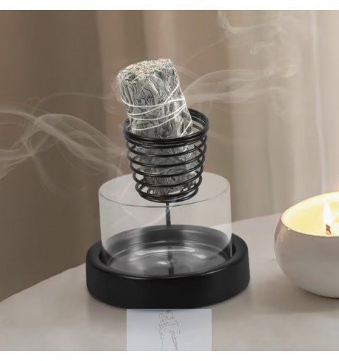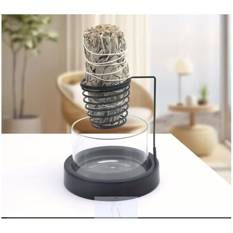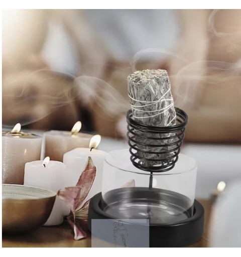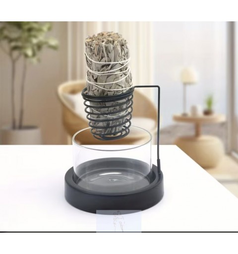 Queimador ideal para tochas de sálvia, que inclui um suporte de metal em espiral e uma base de vidro transparente.