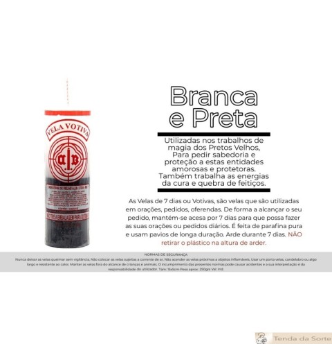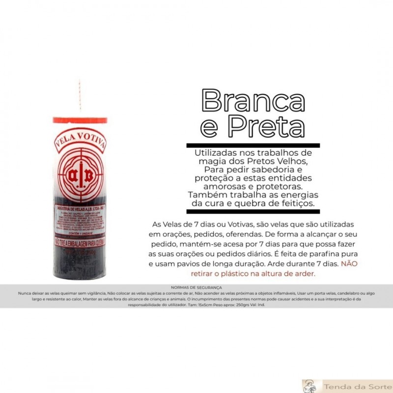 Esta vela de 7 dias preta e branca foi feita a partir das mais finas parafinas e das melhores ceras e tem 15 cm de altura por 6 cm de diâmetro.